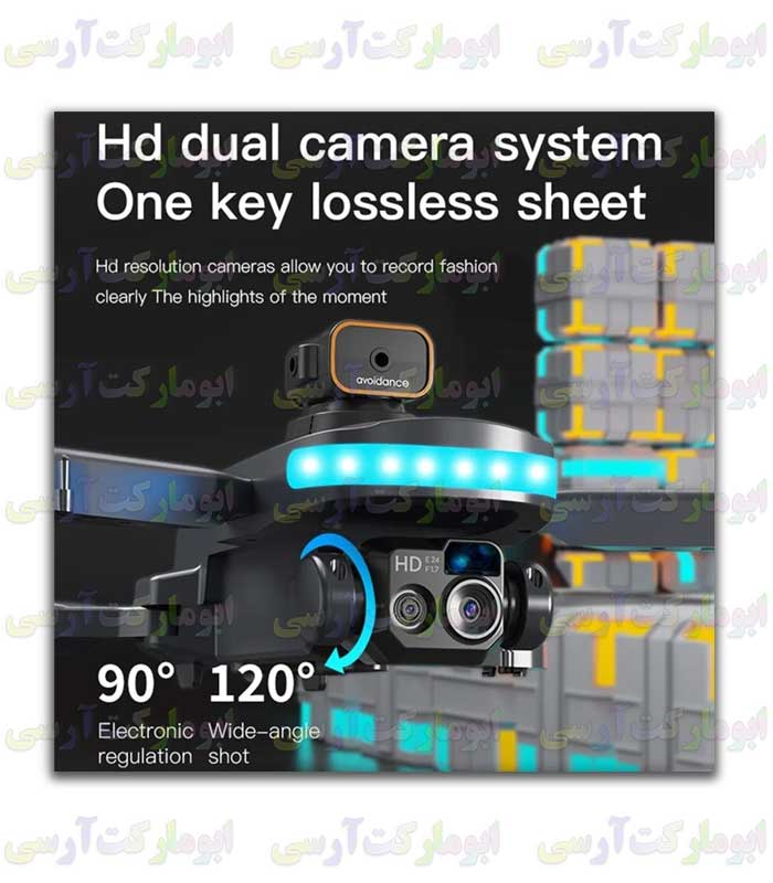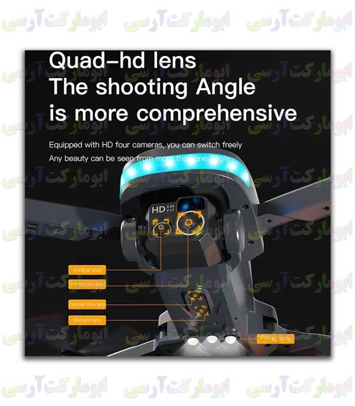 این مدل کواد ۲ دوربینه هست یکی دوربین جلو که از طریق کنترل از راه دور می توانید دوربین جلو ر به بالا و پایین حرکت بدید جهت فیلمبرداری کردن از جلو کواد یا زیرش(۲ دکمه روی کنترل مختص این عمل دوربین است) که تو این رنج قیمتی تو خود چین هم پیدا نمیکنید. دوربین زیر بهمراه فلش نوری (۳ لامپ LED سفید رنگ)هست که در هیچ کواد دیگه ای نیست جهت اینکه در نور کم دوربین زیر هم بتواند تصویر برداری کند